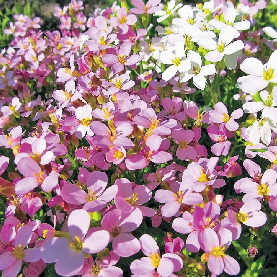 Семена арабиса смесь окрасок подарят возможность украсить садовый ландшафт пушистым цветущим ковром. Это невысокое растение незаменимо при оформлении каменистых горок, бордюров и высоких клумб. Микс позволяет вырастить кусты с белыми и розовыми цветами.