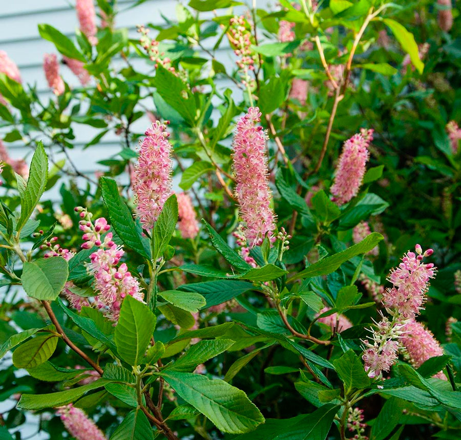 Саженцы клетры ольхолистной (Clethra alnifolia) практически незаменимы при озеленении заболоченных участков или мокрых тенистых низин. Крупномер характеризуется: 1. Кустарник высотой 1,5-2 м; 2. Ветви овальной формы, направлены вверх; 3. Листья очередные, длинные. Цветовая гамма осенью колеблется от золотистой до красной; 4. Цветки розовые, колокольчатые, собраны в колосовидные длинные соцветия; 5. Период цветения июль-август; 6. Зимостоек. Лучше всего высаживать саженцы клетры ольхолистной на песчано-гумусную, рыхлую, кислую, хорошо дренированную почву и в затененном месте с большой влажностью.
