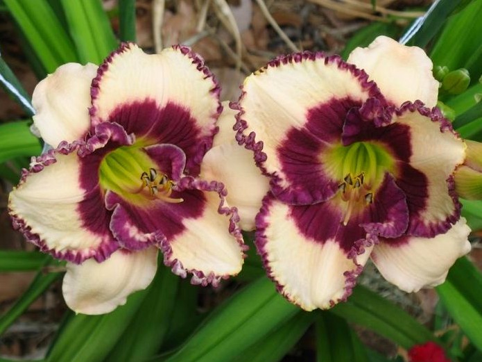 Окраска цветка : кремовый с темно-сливовым пятном и выразительной каймой, горло зеленое