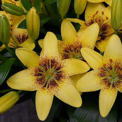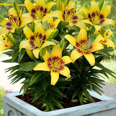 Лилия азиатская "Жуан-Песоа" - это великолепное растение с ярко-желтыми цветками, украшенными крупным бордовым кольцом вокруг центра. Ее стебель достигает высоты до 35 см, что делает ее идеальным выбором для создания ярких цветочных композиций в саду или на балконе. Листья лилии имеют интересную форму, что добавляет изысканности ее облику.
