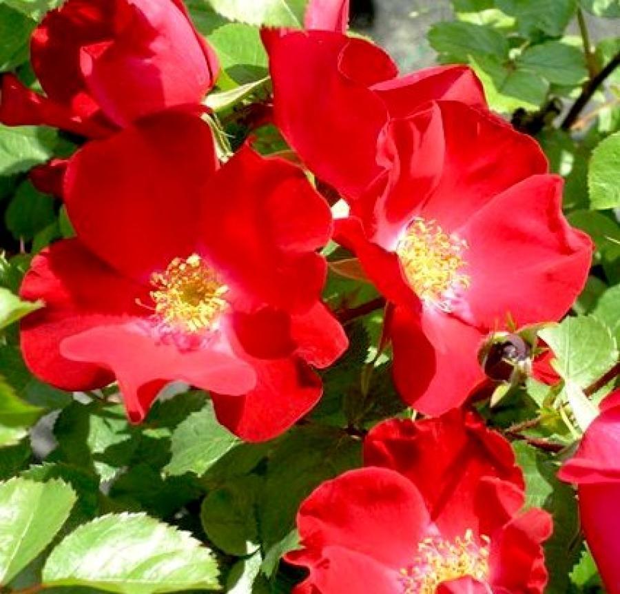 Саженцы розы парковой Робуста (Robusta): выносливый и эффектный сорт будет украшать сад ярко-красными цветами на фоне густой зеленой листвы до конца сезона. Полумахровые цветки простоту форм полностью компенсируют необыкновенно глубоким малиново- красным цветом, с желтыми тычинками в серединках. Лепестки крупные и слегка кудрявые. Взрослые крупномеры могут достигать 2 м в высоту. Побеги тонкие и гибкие, густо покрыты светло-зеленой листвой, которая декоративна сама по себе. Сорт устойчив в характерным для роз болезням. Растение хорошо переносит морозы. Укрывать на зиму нежелательно – побеги могут сопреть весной. Особенности посадки розы Робуста: